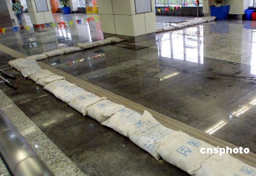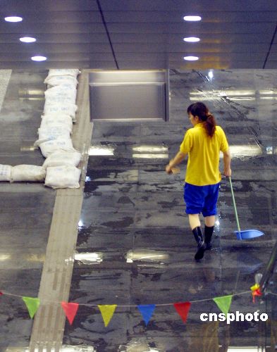 7月11日下午1:00左右,一场暴雨突袭南京。记者1时许在南京东方商场地铁出口处看到,出入乘客有打伞的,没伞的用包挡头。记者抬头发现,地铁出口处的挡雨玻璃竟然缺了一块不翼而飞,倾盆大雨打湿了台阶,平坡已经积水。记者向相关负责人了解情况,该负责人称这里的挡雨玻璃都是进口的,暂时无法补上。问及其他措施,便含糊其辞了。记者下午2时许在地铁小行站,看到入口用警戒绳拉起来,地下负一楼几位清洁工正提着水桶清除地下积水。下午4时,记者再次来到南京东方商场地铁出口,发现原本好好的电梯已经挂上了“电梯维修,暂停使用”的牌子,是大雨淋坏了电梯还是电梯偶然出故障不得而知。中新社发 吴俊 摄