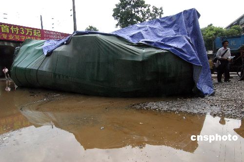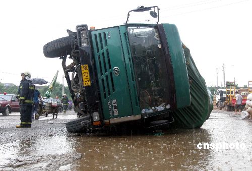 7月12日,娄底市街头一辆货车因大雨路滑翻倒。当日13时许,湖南大部分地方突遭强降雨。据湖南省气象部门介绍,目前湖南的强降雨过程仍在继续,预计将持续到7月17日左右。 自7月6日起,入汛以来最大的一次强降雨袭击湖南。目前,强降雨已使浏阳市、新化县、麻阳县等地出现严重的山洪灾害。此次降雨已造成娄底、益阳、怀化、张家界、岳阳、湘潭等6市14县部分地方受灾。中新社发 郭国权 摄
