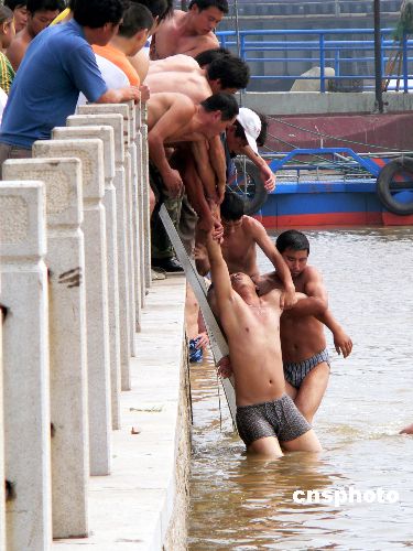 | 7月15日下午14:04分,河北秦皇岛的一位男青年在该市汤河桥下游泳时溺水失踪。闻讯赶来的群众自发组织在失踪水域附近进行了搜救,并拨打120。14:12分,一名男青年在河底摸到溺水青年,在群众帮助下将其拉到岸边进行了急救。经现场人工呼吸等初步抢救,溺水青年吐出大量含有酒精气味的呕吐物。10分钟后,市人民医院120急救车赶到现场将其运往医院。据介绍,目前该青年已经清醒,呼吸心跳逐渐恢复正常,正在进一步观察诊断中。中新社发 李佳明 摄