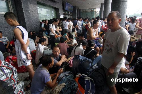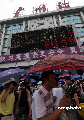 7月16日,京广线乐昌段被暴雨袭击铁路中断,广州火车站对旅客进行特别提示。最近几天,湖南和广东发生强降雨,京广线乐昌段铁路中断,造成京广线乐昌段以南的几个车站滞留大量旅客。记者从广铁集团调度指挥中心获悉,15日13时30分,京广线马田墟至栖凤渡区间下行线铁路一处线路中心塌陷,出现险情。北上乐昌至张滩段(铁路桥跨武江河)路面已被水浸,列车无法通过;南下乐昌至安口段铁路路面也已过水,广铁集团公司启动防洪抢险应急预案,紧急发布各种调度命令。到12时发稿时,旅客仍正在安置过程中。中新社发 郭国权 摄