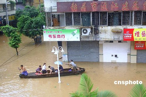 暴雨令广东韶关境内的武江、浈江和北江水位高涨,据七月十六日下午三时韶关水文站的观测数据,水位高达五十六点零九米,超出警戒水位三米多。 受洪水影响,在韶关市区,洪水漫上街道,多处居民住宅楼处在洪水包围之中。 图为部分市民回家要坐小船。中新社发 冯昶 摄