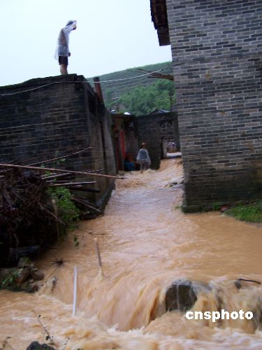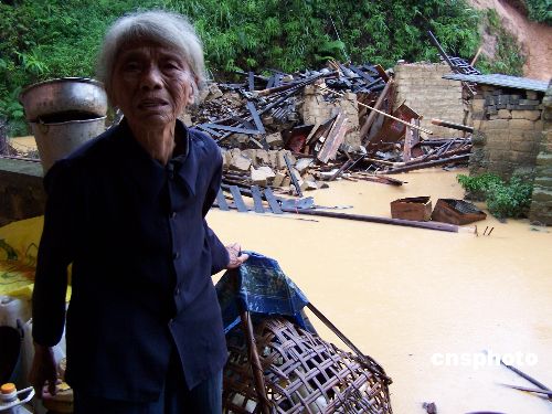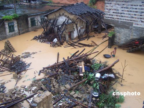 七月十七日,持续了一天的暴雨使得广西玉林市兴业县城隍镇一个百余人的小山村遭受严重破坏,一百五十多人被迫转移。中新社发 王刚 摄