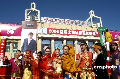 七月十八日,2006乌鲁木齐丝绸之路国际服装服饰节在新疆国际博览中心隆重开幕,来自俄罗斯、巴西、巴基斯坦、吉尔吉斯斯坦、乌兹别克斯坦等国及国内的艺术团体和采购商一千一百余人参加了本届国际服装节。其间将举办丝绸之路国际模特大赛总决赛及多场中外著名服装设计师作品秀。中新社发 刘新 摄