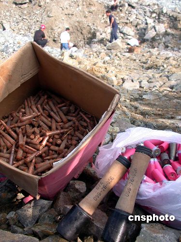 7月18日上午,山东日照警方在岚山区虎山镇一废弃矿区内集中销毁2吨废旧弹药。据了解,其中除500余枚手榴弹、地雷、鱼雷等废旧炸弹外,还有万余发旧子弹和一批黑火药、炸药、雷管等。据悉,这批废旧危爆物品是警方在近年来专项整治行动中,或收缴或在挖河、建筑等施工工地清理所得。中新社发 日照孟锋 摄