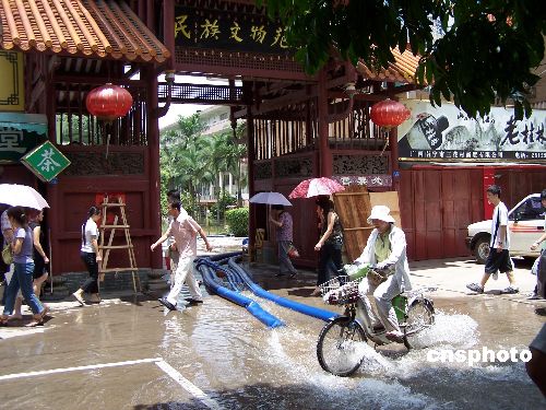 七月十九日,广西南宁雨过天晴,市内主要干道的积水基本消退,图为市民忙着抽掉较低地段的积水。十八日,广西首府南宁遭受大暴雨袭击,致使市区多处内涝,造成道路中断交通瘫痪。中新社发 王刚 摄