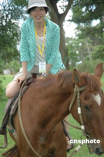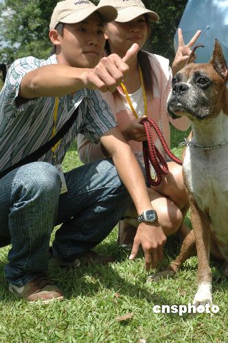 二00六“宝岛行”海峡两岸大学生夏令营正在海南岛举行。图为来自台湾的学生二十日在海南岛琼海市的台资观光休闲农场看拳师犬表演后合影。中新社发 王辛莉 摄
