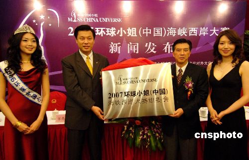 6月30日,2007环球小姐(中国)海峡西岸大赛组委会在福州举行新闻发布会。该赛事由环球小姐中国总部、福建省对外文化交流协会主办,中国新闻社福建分社等单位共同承办。福建省新闻办主任朱清(右二)、中国环球小姐总部总裁秦臻(左二)、2003年环球中国小姐吴薇(右一)、2006年环球中国小姐高英慧(左一)出席该新闻发布会并为2007环球小姐(中国)海峡西岸大赛组委会揭牌。中新社发 刘可耕 摄