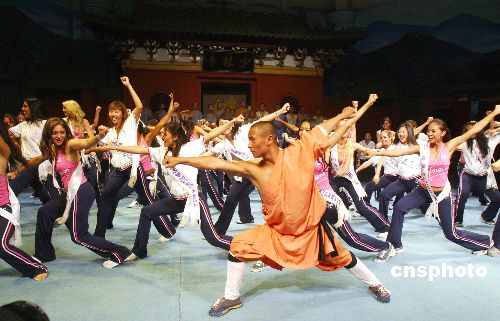 七月三日,国际旅游小姐在少林武僧的指导下学习少林武术。当日,二零零六国际旅游小姐一行八十七位佳丽来到河南嵩山少林寺参观,观看少林功夫表演,并跟随少林武僧习武。中新社发 慎重 摄