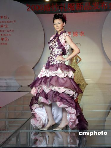 七月十二日,一批海内外知名婚纱品牌以顶尖的婚纱礼服在上海世贸商城演绎超级婚纱秀,并为次日举行的“第十届中国·上海国际婚纱摄影器材展”造势。来自台湾的一款婚纱以局部抓皱的泡泡裙带出的线条对比,将礼服款式加入了更多层次强烈的装饰风格。中新社发 南星 摄