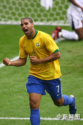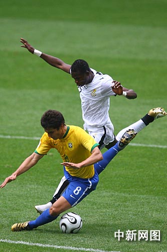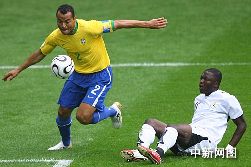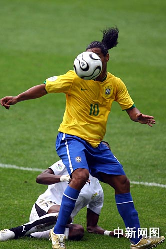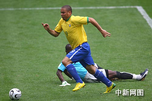 6月28日凌晨,巴西队在世界杯1/8决赛的一场新老对话中以3比0完胜非洲新军加纳挺进八强,罗纳尔多、阿德里亚诺和泽·罗伯托各入一球,其中罗纳尔多的进球为其在世界杯决赛阶段打进的第15个进球,打破了穆勒保持的14球的世界杯总进球纪录。摄影:中新社记者盛佳鹏