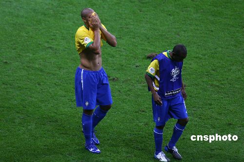 当地时间七月一日晚,世界杯四分之一决赛巴西与法国的比赛在法兰克福世界杯体育场进行,法国队最终凭借十二号亨利的一粒进球,一比零淘汰了前世界杯得主巴西队,晋级四强。图为比赛结束后,巴西队主力罗纳尔多掩面离场。中新社发 盛佳鹏 摄