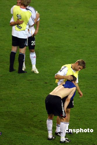 北京时间六月五日凌晨(德国多特蒙德当地时间七月四日晚),世界杯半决赛德国与意大利的比赛在多特蒙德世界杯体育场进行,双方激烈拚抢至加时赛,最终德国队在终场前被意大利队的格罗索和皮耶罗连下两城,零比二不敌意大利队,被淘汰出局。图为德国队员在比赛结束后互相安慰不肯离场。中新社发 盛佳鹏 摄