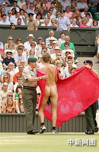 7月4日,当俄罗斯网球美女莎拉波娃与德门蒂耶娃温网女单四分之一决赛进行到第二盘比赛时,一名男子突然从看台上跑下来,迅速地脱掉了衣服,奔向球场。球场的警卫迅速将其捕获,并且用红毯子将其身体包裹起来。事后英国警方证实,这名裸奔者是荷兰的一位音乐节目主持人,名叫桑德尔·兰廷加,现年29岁。