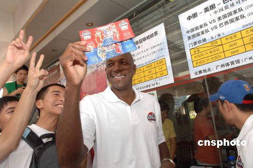 七月八日,NBA巨星克莱德·德雷克斯勒(中)在广州“中美巴对抗赛”售票现场与球迷亲密接触。中新社发 何泉 摄