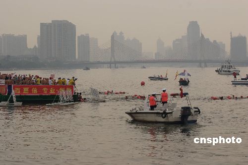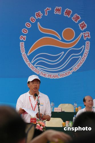 | 7月12日下午2时40分,在广州市市长张广宁鸣笛发令后,广州3500余市民开始横渡珠江。参与人数比彩排时增加了2倍,年龄段也出现了变化,最小年龄将下降到9岁。横渡珠江活动的起点为中大码头、终点为星海音乐厅,两岸直线距离约450米,横渡路线距离约800米。当天下午2时上演水上摩托艇表演助兴,2时30分正式下水,预计下午5时结束。为确保安全,活动组委会在横渡区域内两边设置了固定救生艇40艘,同时设置流动救生橡皮艇10艘,每艘救生艇配3名救生员,共有艇上专职救生员150人,还有20名潜水员在下游急救艇待命。中新社发 吕明/吴吕明 摄