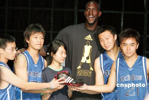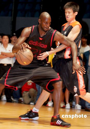 NBA巨星、明尼苏达森林狼队的“狼王”凯文·加内特,7月13日上午开始他首次中国内地旅行的第一站,在北京朝阳体育馆与数千名中国的崇拜者亲切会面时非常投入地与五名中国少年篮球选手“过招”。中新社发 任晨鸣 摄