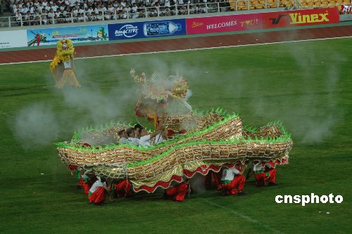 七月十五日晚,喷云吐雾的“巨龙”为在澳门运动场举行的第十二届亚洲田径锦标赛开幕式助兴。中新社发 史利 摄