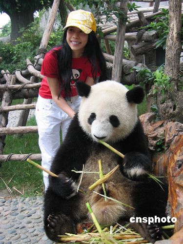 7月12日,香港著名影星、歌星莫文蔚来到成都大熊猫繁育研究基地,与国宝大熊猫“思缘”有了“第一次亲密接触”。中新社发 程基 摄