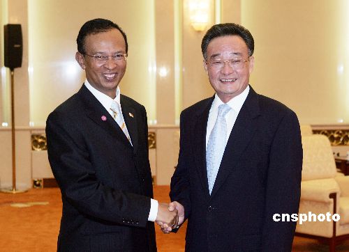 中国全国人大常委会委员长吴邦国,七月三日在北京人民大会堂会见来访的马达加斯加参议长拉杰米松。中新社发 毛建军 摄