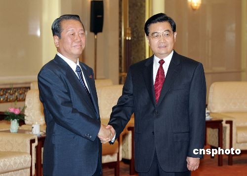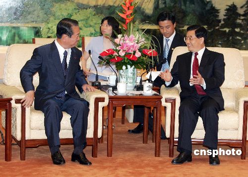 七月四日,中共中央总书记胡锦涛在北京人民大会堂会见日本民主党党首、众议员小泽一郎率领的日本民主党代表团。中新社发 毛建军 摄