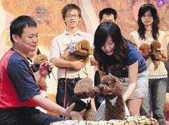 中新网7月21日电 桃园县台茂购物中心日前举办一场“世纪狗婚礼”,狗新人Loyal、Mini,以及20只伴郎、伴娘、花童都是当红的红贵宾犬,狗新人有模有样穿著婚纱、礼服,由饲主或牵或抱走红地毯,完成结婚仪式,其中的狗新郎Loyal还曾与名模林志玲拍过电视广告。