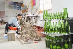 艺术家们随意创作,捡来的破碗、树枝、石头都是他们的创作素材。他们把废弃兵营清理出来的一堆卵石,在营区前堆置了“翼手龙”;艺术家吴伊凡也用卵石堆了一只蜥蜴,她用糯米粉、稻草屑、粗糠,混水捏制人像、蜥蜴。艺术家把卷曲的废泡棉上色,里面装了圣诞灯泡,就成装置艺术“月亮”。