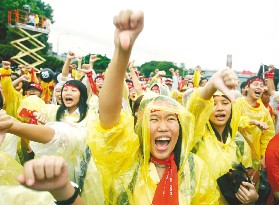 中新网9月16日电 据台湾《联合报》报道,围城游行的队伍昨天下午出发后,由超过五千名高中生、大学生打头阵,大多数学生没穿雨衣,走在雨中嘶吼“阿扁下台”;一群考完模拟考相约上街游行的高中生说,“你倒扁了没有?”已经是校园的招呼语了。
