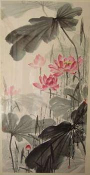在詹仁左的画展上可以看到,马英九表姐鄂梅约的国画,无论构图还是题词与当初汪道涵约的几乎完全一样,都选择以“荷花”为主题,画上所画为“并蒂莲”。詹仁左告诉记者,汪老选择荷花的用意是:“荷花,有和平、和谐的谐音。”当时在病榻上的汪老,还为此画题词“同根并蒂一池开,清香雅韵满人间”。