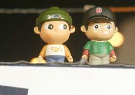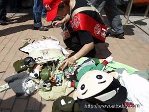 据台湾东森新闻报道,琳琅满目的阿扁娃娃、阿扁贴纸在现场被铺得满地都是,因为今日是民进党20周年“党庆”,倒扁总部送出的生日贺礼就是把这些阿扁纪念品退还给民进党。