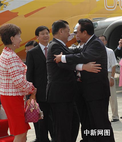 中新社海口十月十六日电 (记者 刘舒凌 杨旭 王辛莉)中国国民党荣誉主席连战十六日中午抵达海口美兰机场。中共中央台办主任陈云林到机场迎接。