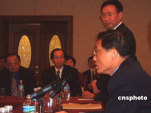 当地时间七月二十三日,海峡两岸关系协会常务副会长李炳才率领访问团结束了对美国为期六天的访问。当日访问团一行和洛杉矶的侨领和旅美台湾同胞的代表进行座谈,听取了有关发展两岸关系的意见和建议,重点就胡锦涛总书记提出的构建和平稳定发展的两岸关系进行了阐述。中新社发 贾国荣 摄