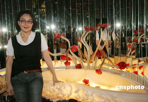 新近,台湾琉璃艺术家杨惠姗设计打造的“琉璃厕所”在上海琉璃博物馆内供观众使用, “琉璃厕所”的坐便器、洗手池及四周陈设全部选用晶莹剔透的琉璃材质,在典雅的灯光照射下,“琉璃厕所”像水晶宫一样华丽,使“厕所”无疑成为该博物馆中一件别致的艺术品,受到观众的赞叹。杨惠姗说,厕所刚建成时,许多人使用后都不愿走开,甚至在厕所里吃饭。中新社发 潘索菲 摄
