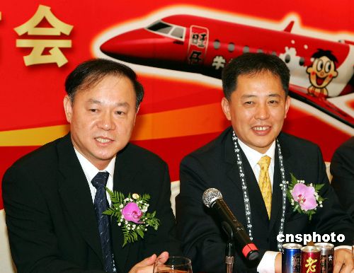 8月18日,台湾旺旺集团成为大陆台商首个引进公务机企业。旺旺集团副总裁林凤仪(左)在上海举行的发布会上表示,在目前两岸尚未开通直航的情况下,这架公务机仅限在大陆航管区内飞行。但他希望,“旺旺公务机”能成为第一架体验两岸直航的飞机。旺旺集团在大陆投资十多年来,取得丰硕成果,此番以2亿多元人民币购得湾流200公务机,旨在表明企业在大陆取得的成就。中新社发 潘索菲 摄