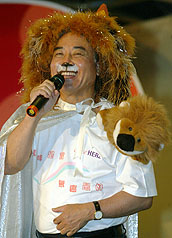为了一圆癌病儿童和卡通明星同欢的梦想,台“立法院长”王金平20日脸部彩绘,扮成“狮子王辛巴”和多啦A梦等人偶,为小朋友说故事,鼓励病童要把病魔三振出局。(台湾“中央社”图 郭日晓摄)