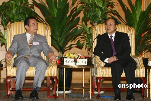 八月二十一日,中国国台办常务副主任郑立中(右)在北京会见了由台湾工业总会理事长陈武雄(左)率领的“台湾工业总会大陆经贸考察团”一行,郑立中向考察团介绍了大陆经济建设和两岸经济合作的有关情况,并欢迎台湾企业家到大陆投资发展。考察团将在北京、江苏、上海进行为期七天的经贸考察活动。该总会下属一百四十二个行业公会,包含了台湾近九万家生产型企业。中新社发 盛佳鹏 摄