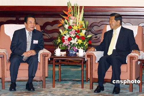 八月二十一日,中共中央政治局常委,全国政协主席贾庆林在北京会见了由台湾工业总会理事长陈武雄(左)率领的“台湾工业总会大陆经贸考察团”一行。考察团将在北京、江苏、上海进行为期七天的经贸考察活动。该总会下属一百四十二个行业公会,包涵了台湾近九万家生产型企业。中新社发 盛佳鹏 摄