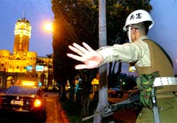 中新网9月1日电 据台湾《中国时报》报道,“百万人民反贪腐”总部将在9月1日下午正式进驻台北凯达格兰大道,并从晚间起举办“试坐”活动,面对倒扁行动来势汹汹,“总统府”前广场已出现荷枪实弹的宪兵站岗,但只要一看到媒体拍摄,值勤宪兵就赶忙以手阻挡镜头,并随即撤离现场。(王爵暐摄)