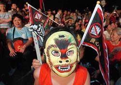 中新网9月3日电 据台湾《中国时报》报道,陈水扁已在今日(3日)启程“出访”,岛内团体“民盟”2日晚间举办“抓瘟神”、“送瘟神”活动藉以讽刺陈水扁“出访”,现场不少民众头戴各式夸张的面具以表达诉求。(季志翔 摄)