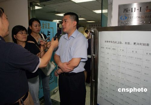 九月六日,首次两岸中秋包机在上海开始出票,上航上海营业部副总经理夏友培表示,基于油价上涨等因素,上海至台北航线经济舱往返票价为四千七百元人民币,比春节包机票价上涨了四百元左右。两岸包机只有常态化,航空业者才能赢利。中新社发 潘索菲 摄