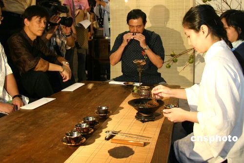 9月6日,2006台北茶博览会在台北“小巨蛋”开幕。图为台北市长马英九到场品茗。中新社发 肖龙联 摄