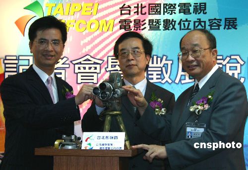 9月7日下午,主办单位在台北举行记者会,宣布2006台北影视节将于2006年11月举行。图为主办单位代表将手放在台湾最老的一台摄像机上让记者拍照。中新社发 肖龙联 摄
