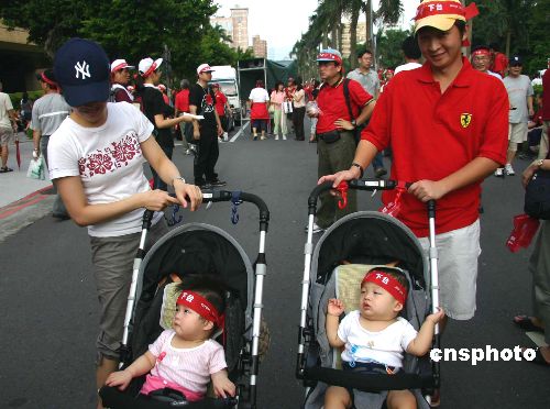 9月9日下午,“百万人民反贪腐倒扁静坐”活动在台北正式启动。图为一对年轻夫妇带着双胞胎孩子参加。中新社发 肖龙联 摄