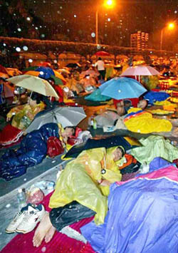 台湾“百万人反贪腐倒扁静坐活动”支持民众跨夜静坐,即使冒着细雨,大家仍穿着雨衣、撑伞,在凯道上度过第一夜。 (台湾《中国时报》图 高政全摄)