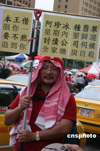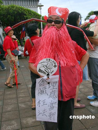 图为台北街头,一名老人扮成“红须包公”参加倒扁行动。