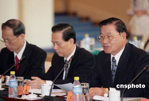 九月十八日,中共中央台办常务副主任郑立中与中国国民党副主席江丙坤,在北京就台商权益保障举行会谈。图为江丙坤出席会谈。中新社发 盛佳鹏 摄