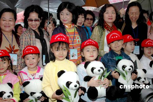 参加第三届海峡两岸妇女发展交流活动的七十三名来自海峡两岸的各界知名妇女人士,九月二十二日来到成都大熊猫繁育研究基地,开始“姐妹携手,共促发展”——川蜀文化亲近熊猫之旅。图为代表团成员与成都小朋友在熊猫基地欢聚一堂。中新社发 鲁彦 摄