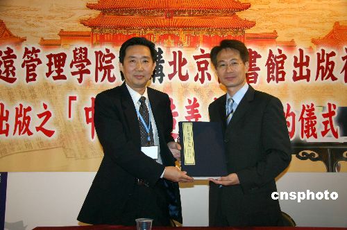 正在台北举行的第二届海峡两岸图书交易会上,来自大陆的一套最贵书籍《中华再造善本》,九月二十二日找到买家,由台湾致远管理学院购入收藏于该校图书馆。《中华再造善本》由北京图书馆出版社出版,是大陆近年来投入最大的古籍整理出版工程,旨在“继绝存真,传本扬学”,共分为“唐宋编”、“金元编”、“明代编”、“清代编”以及“少数民族编”,全套近万册。《图为在当天上午的订购签约仪式上,北京图书馆出版社副社长赵海明(左)向台湾致院管理学院副校长郭添财转交典籍。中新社发 林国瑞 摄