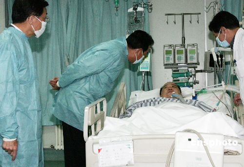 | 九月二十五日,国台办主任陈云林前往北京中日友好医院,看望了在那里接受治疗的台胞颜文雄及其亲属,并听取了院方的最新救治进展。九月十一日,台湾一旅游团在吉林省汪清县境内发生车祸,两位台胞和一位大陆司机在此次旅游团车祸中不幸遇难,十八位台胞受伤,其中十五位已返回台湾,曾明美、杨穗英、颜文雄等三位台胞现在分别在北京友谊医院、北京协和医院和中日友好医院接受救治,目前三人恢复状况良好。图为陈云林听取院方的最新救治进展。中新社发 武仲林 摄