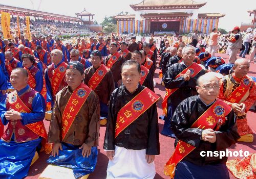 9月27日,由台湾大甲镇澜宫发起组织包括台湾大甲镇澜宫在内50座宫庙的“2006台湾妈祖联谊会暨大甲镇澜宫湄洲谒祖进香团”一行四千三百多名台湾妈祖信众及海内外来宾、妈祖信众共计一万多人,在福建莆田湄洲岛天后广场参加在此隆重举行的大型谒祖进香大典和民俗文艺表演活动。据悉,这是迄今为止规模最大的台胞到大陆进香交流活动。中新社发 刘可耕 摄