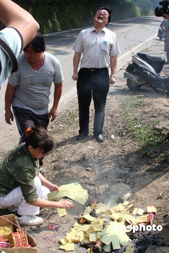 10月3日中午,台湾南投遭遇车祸的旅游巴被吊离信义乡事故现场。该部旅游巴载着十九位大陆游客和一位台湾导游,10月2日晚间途经上述路段遭遇重大车祸,造成六人死亡,十五人轻重伤。图为乘坐另一部旅游巴的刘姓领队在现场烧冥纸表达哀思。中新社发 黄少华 摄
